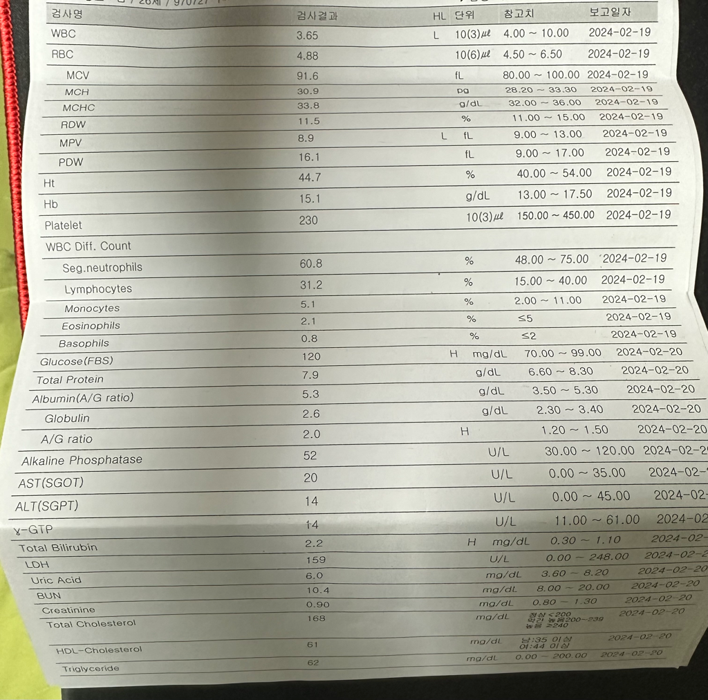 혈액 검사 결과를 분석해 보겠습니다. * 백혈구 수치가 낮다는 것은 면역력이 떨어져 있다는 의미입니다. 면역력이 떨어지면 감염에 취약해지므로, 평소보다 더 조심해야 합니다. * 혈당이 120이 나왔다는 것은 공복혈당이 126mg/dL 이상인 것을 의미합니다. 공복혈당이 126mg/dL 이상이면 당뇨병 전 단계로 분류됩니다. 당뇨병 전 단계는 당뇨병으로 진행될 가능성이 높으므로, 평소 식습관과 운동량을 조절하고, 정기적으로 혈당 검사를 받아야 합니다. * 빌리루빈이 높다는 것은 간 기능에 이상이 있다는 의미입니다. 간 기능에 이상이 있으면 빌리루빈이 대사되지 못하고 혈액에 쌓이게 됩니다. 간 기능에 이상이 있을 때는 추가 검사를 받아야 합니다. 추가 검사로는 간 기능 검사, 혈액 검사, 복부 초음파 검사 등이 있습니다. 추가 검사를 통해 간 기능에 이상이 있는지 확인하고, 적절한 치료를 받아야 합니다. 혈액 검사 결과를 분석해 보았으니, 추가 검사를 받아보시기 바랍니다. 추가 검사를 통해 간 기능에 이상이 있는지 확인하고, 적절한 치료를 받아야 합니다. * 소변 검사 결과를 분석해 보겠습니다. * 잠혈은 소변에 혈액이 섞여 있는 것을 의미합니다. 잠혈이 나오는 원인은 여러 가지가 있지만, 가장 흔한 원인은 요로 감염입니다. 요로 감염은 세균이 요도를 통해 방광으로 들어가서 발생하는 감염입니다. 요로 감염이 있는 경우, 소변에 혈액이 섞여 나올 수 있습니다. * 잠혈이 나오는 다른 원인으로는 신장결석, 신장암, 전립선암 등이 있습니다. 잠혈이 나오는 경우, 추가 검사를 받아서 잠혈의 원인을 확인해야 합니다. 잠혈의 원인을 확인하고 적절한 치료를 받아야 합니다. 소변 검사 결과를 분석해 보았으니, 추가 검사를 받아보시기 바랍니다. 추가 검사를 통해 잠혈의 원인을 확인하고, 적절한 치료를 받아야 합니다.