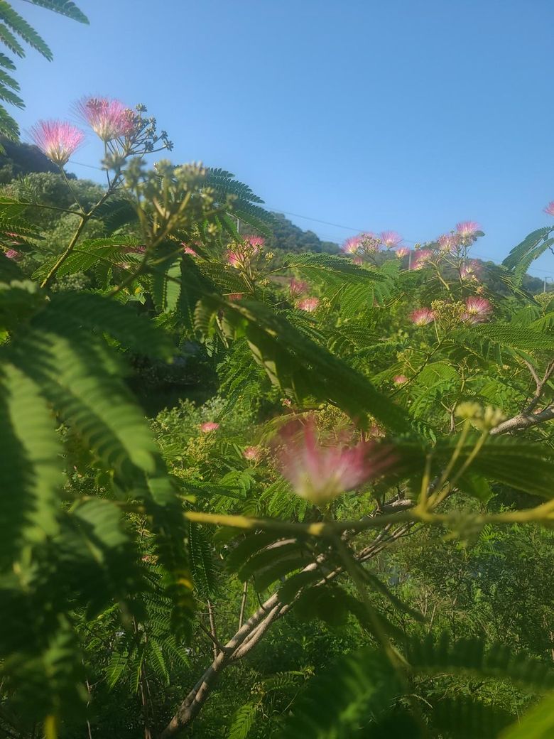사진에서 보이는 솜털처럼 생긴 분홍색 꽃이 자귀나무의 가장 큰 특징인데, 낮에는 잎을 펼치고 있다가 밤에는 잎이 서로 마주 보며 접히는 특징이 있어서 '합환수''라고도 불립니다.