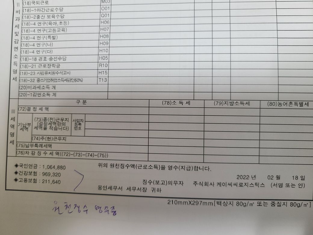 원천징수영수증상의 결정세액이 0원이라는 뜻은 납부할 세금이 없다는 의미이고, 기납부세액은 기존에 질문자님의 급여에서 원천징수된 세금이 없다는 뜻입니다. 따라서 납부할 세금도 0원이고, 납부한 세금도 0원이기 때문에 환급받거나 추가로 납부할 세금이 없는 것이 정상입니다.