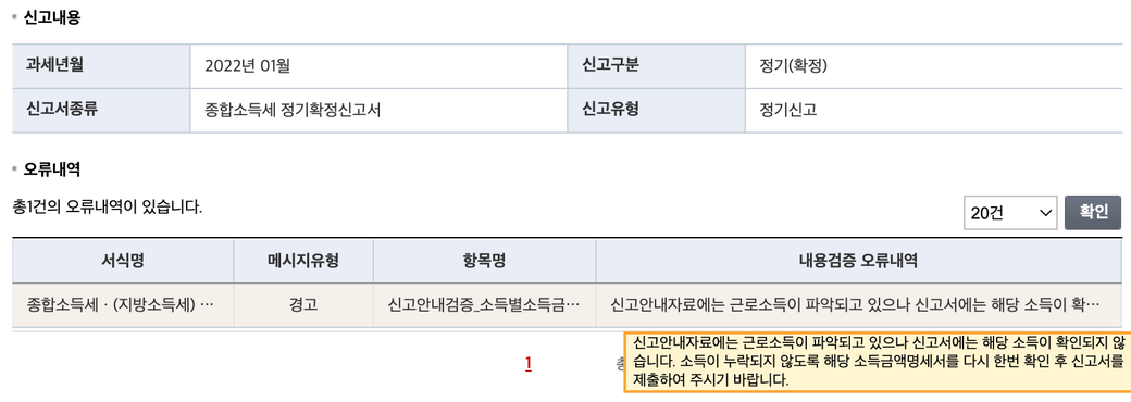 안녕하세요 - 종합소득세 신고 제출시 경고 메시지