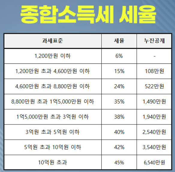 개인사업자와 근로소득자에게 적용하는 소득세율은 6% ~ 45%로 동일합니다.