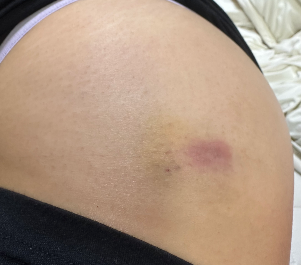노랗게 멍든부분은 이틀 전에 맞은 부분이에요ㅜㅜ