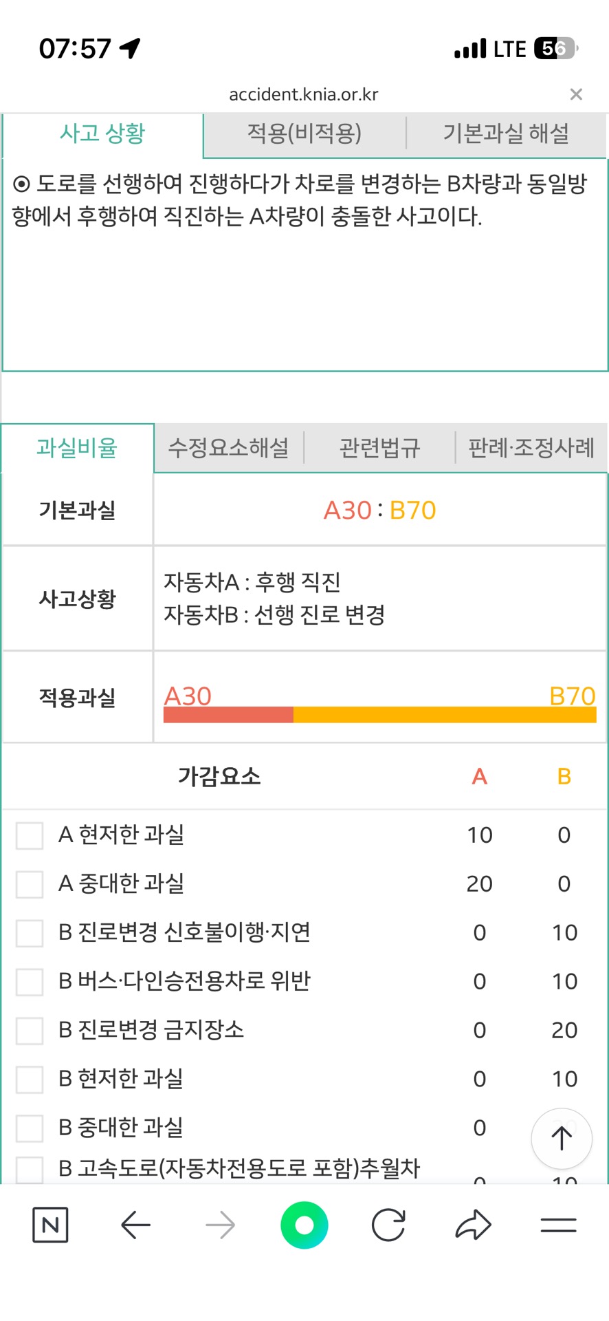 여기에 사고상황에따라 급차선 변경시나 방향지시등 미점등이 있을 경우 추가 과실을 산정합니다.