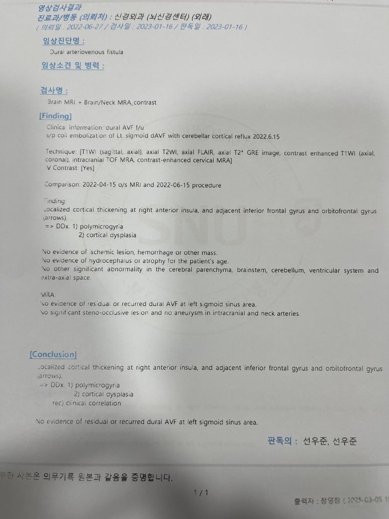 보험처리를 했었는데 당시 출혈이있다는 소견을들은거같은데 진단서상에는 뇌동정맥루 코드만있어 뇌출혈관련 보험청구를 못하여서 위무기록사본을 다운받았는데 뇌출혈에 관한 언급이 기록되어있는지 궁금하셨군요