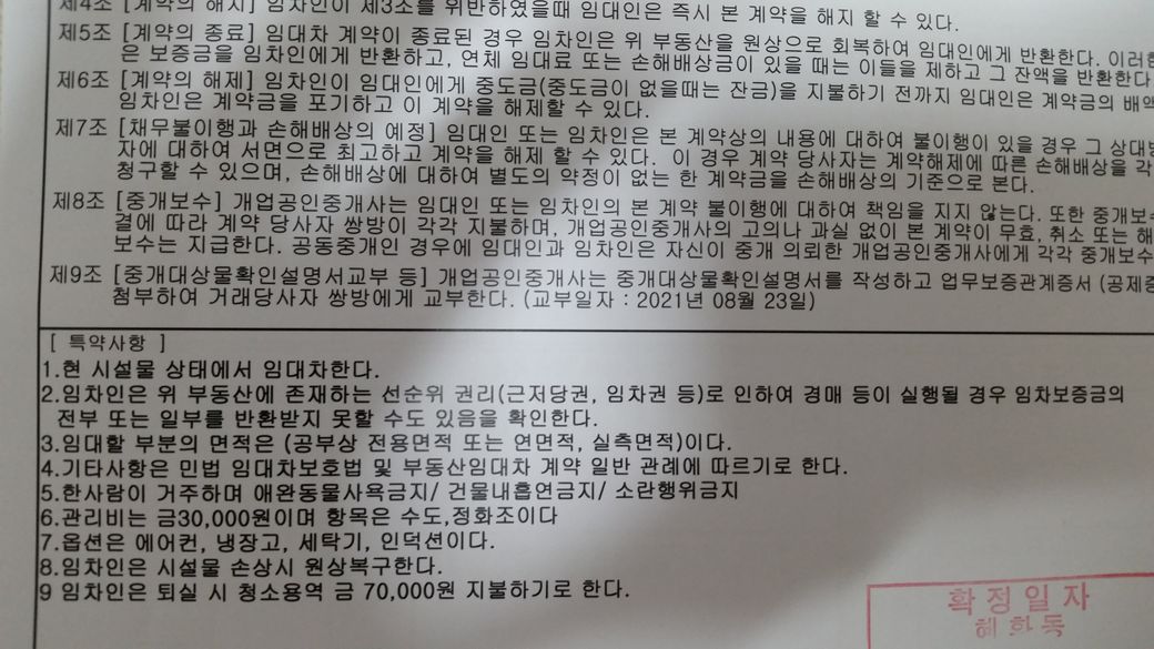 저번달 9월에 계약했습니다. 그 때 상황이 집주인이 부동산에 늦게 온다고 해서 부동산 아줌마하고 계약하고 나서 조금 있다가 왔습니다. 인사만 하고 집에 갔습니다. (특약에 대한 얘기 안하고요.)