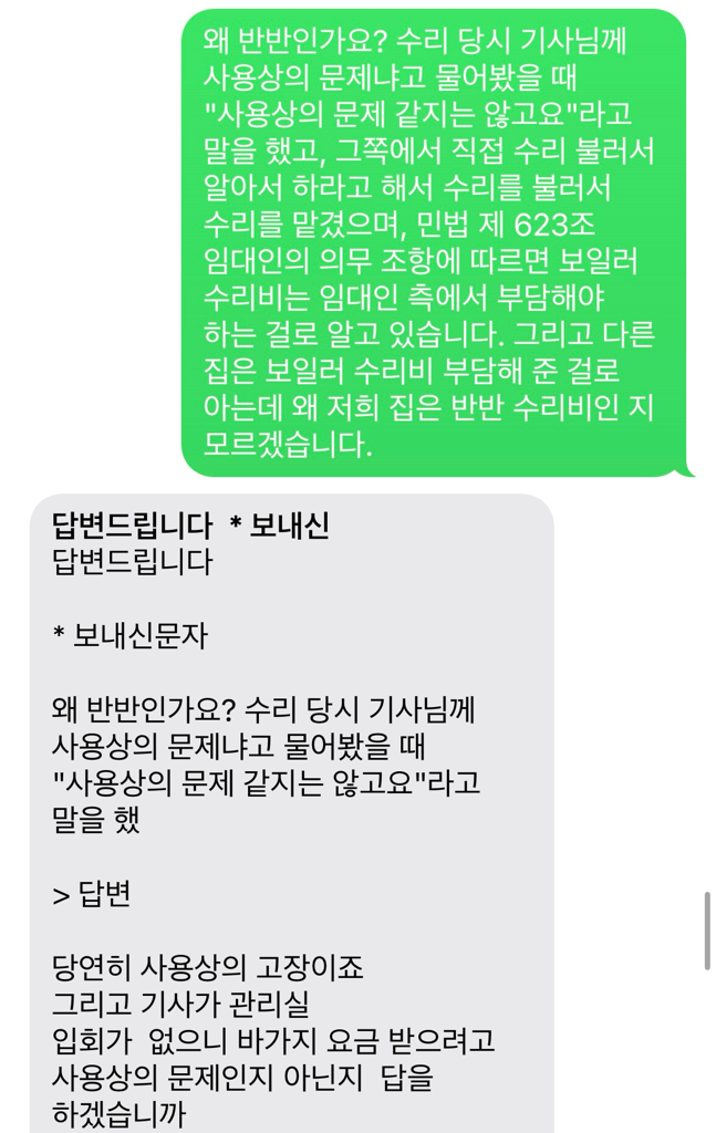 임대인은 보수의무를 부담하고 있기 때문이 보일러 고장이 임차인의 과실로 발생한 경우가 아닌한 임대인이 전액 부담해야 하며, 기재내용상 임차인의 과실이 있다는 부분이 없어 보여 민사소송절차 진행이 가능할 것으로 보입니다.