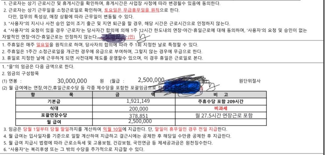 안녕하세요. 근로계약서 일부 첨부합니다.