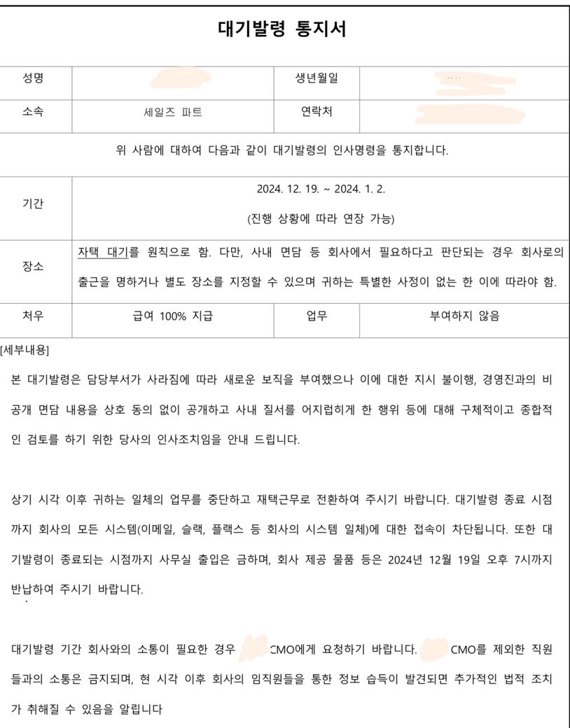 위 내용도 말이 대기발령이지 징계성에 가깝다고 생각됩니다.