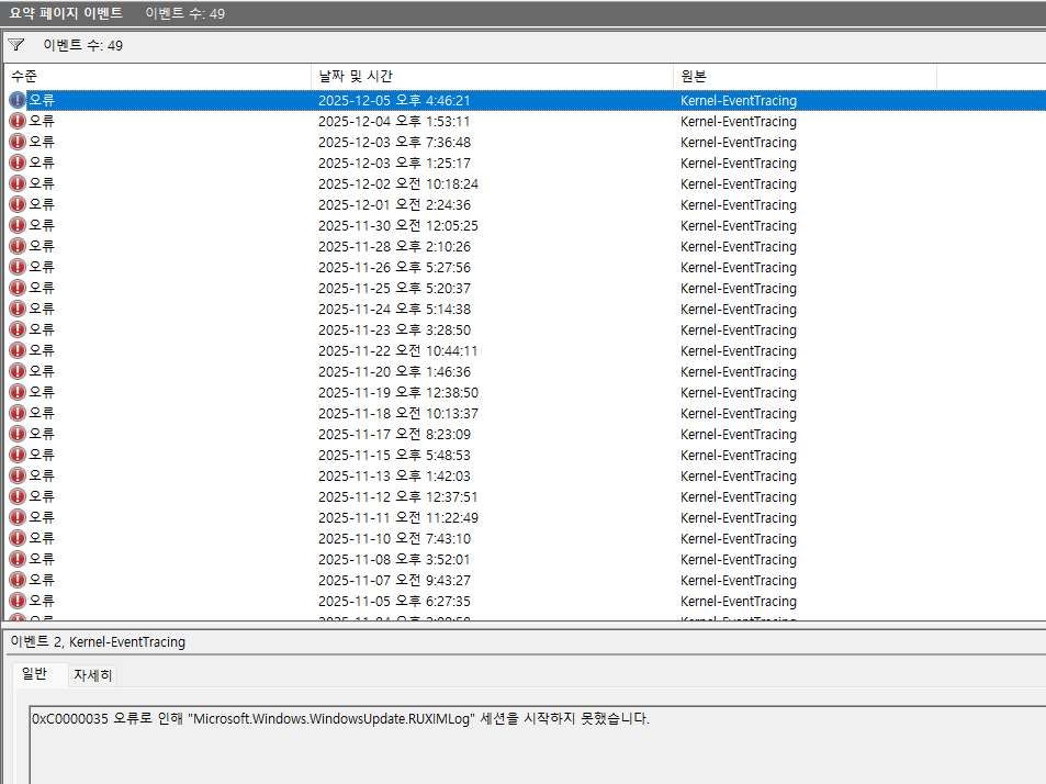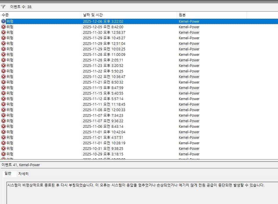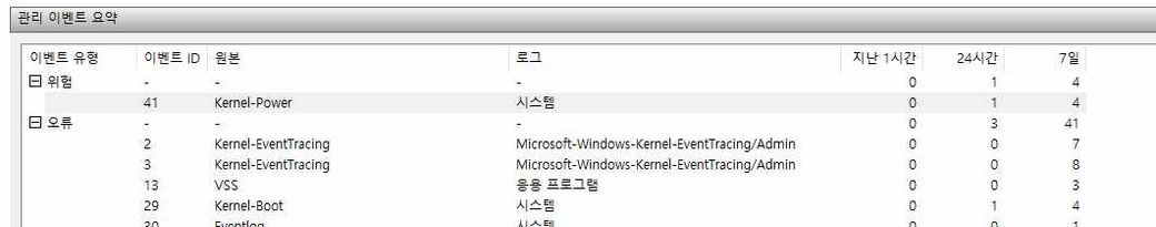 이벤트 뷰어는 pc의 동작 상태 로그를 기록하는 것인데 위험, 오류, 경고 등 등급별 분류로 심각성을 구분해 줍니다. 그림의 오류는 pc 부팅과 윈도우 업데이트 관련으로 매우 위험한 오류가 발생 중임을 보여줍니다. 윈도우를 새로 설치하는 것이 권장되는 수준으로 보입니다.