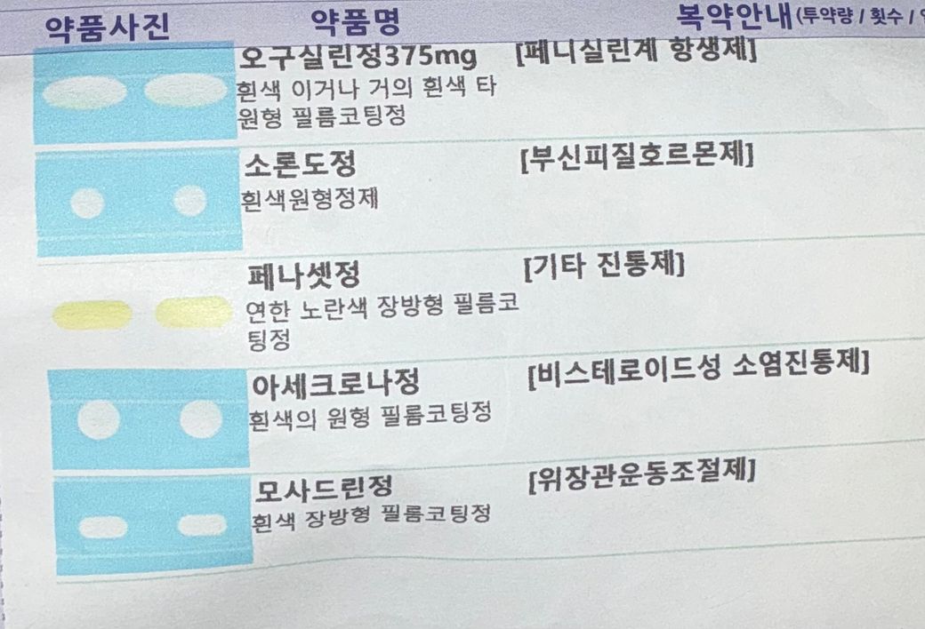 항생제는 오구실린정이고 다른 약은 사진에 첨부하겠습니다.