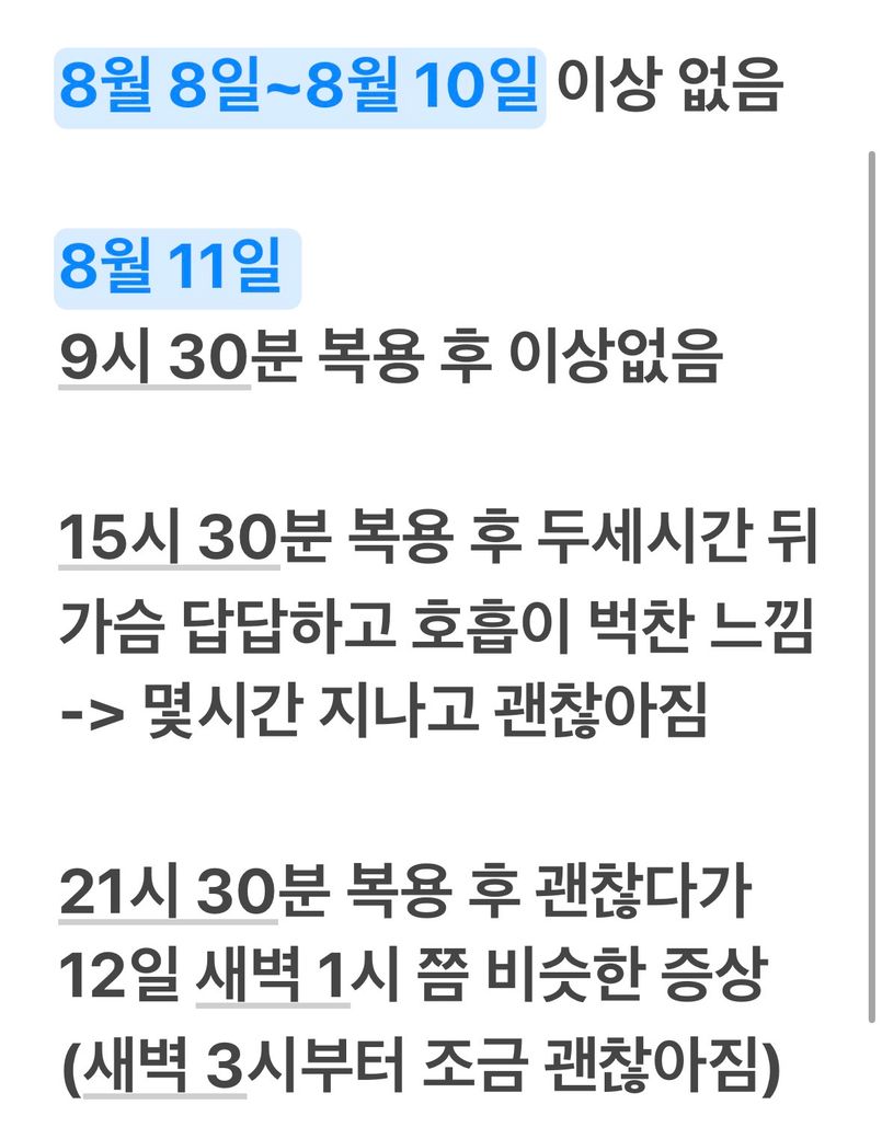 처음 이틀동안은 괜찮다가 삼일째부터 약 먹고 시간이 지나면 가슴이 엄청 답답해져요.