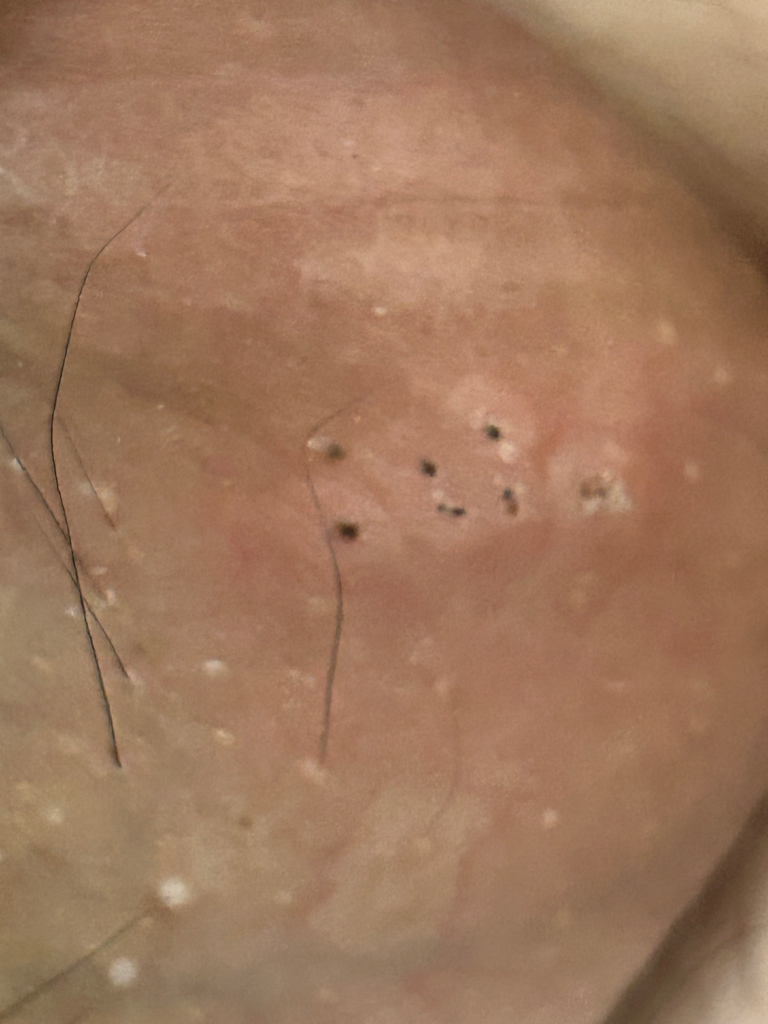원발병소는 보이지 않고 간지러움때문에 긁어서 피부에 딱지가 앉아있어 이것만 보고 진단이 어렵습니다.