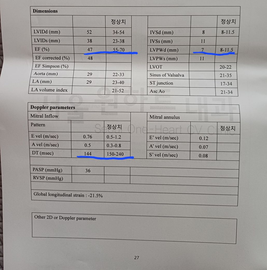 스트레스를 받으면 심장이 답답한 증상이 있어서 심초음파을 찍어 봤습니다. 대충 봐도 상태가 많이 안좋은 것 같은데.. 해석 꼭좀 부탁드립니다...!