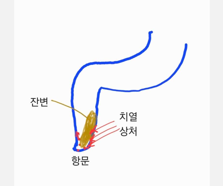 질문) 그림처럼 항문 아주 근처(항문 안쪽)에 잔변이 꽤 남은 상태로 놔둘 경우(24시간 정도)
