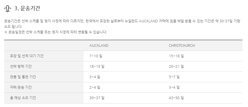 그리고 해상택배의 경우에는 가격은 조금 더 저렴하지만 1달에서 1달반정도의 기간이 있어야지 뉴질랜드 현지에 도착 및 통관이 완료된다고 보시면 됩니다.