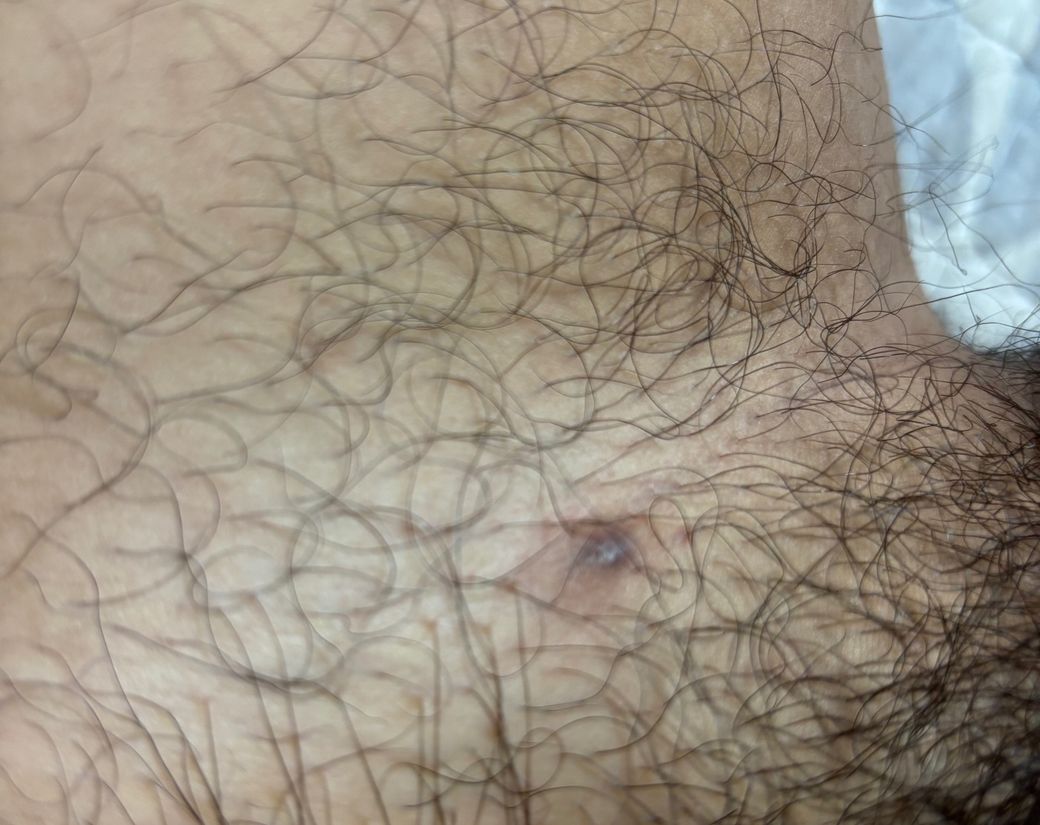 모낭염같은 염증이 생겼다가 상처 관리가 잘 안되면서 염증이 생기고 착색이 되어 색이 변한 상태로 보입니다.