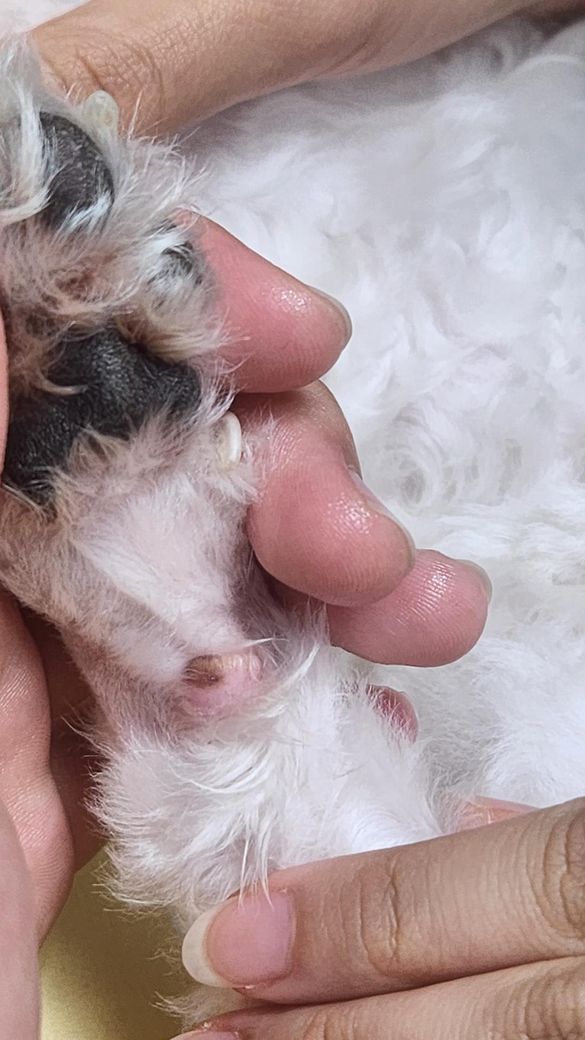 사진상으로는 정상으로 보입니다. 나이 들면서 발바닥 패드의 색소 침착등이 일어나는것은 정상적인 반응으로 봅니다.