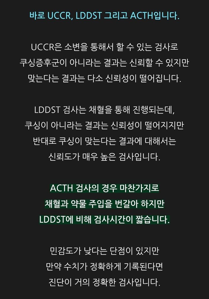 쿠싱 검사는 총 3가지로 알고있습니다.. 다름이 아니라 최소한의 검사로 쿠싱 증후군 판정을 받을수있는 방법이 없을까요? 소변 검사 UCCR 만으로는 쿠싱약을 받는 경우는 없을까요?