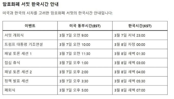 가상화폐 서밋은 트럼프 대통령과 가상화폐 관련 기업, 정부 관계자들이 미래 발전 방향에 대해서 토론하는 것을 말합니다. 한국시간으로 11시부터 7시까지 계속됩니다.
