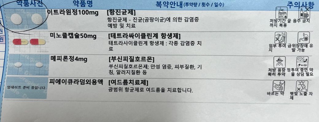 작년에 뒤집어졌을때는 피지조절제를 3개월 먹었고,올해에도 한달전부터 뒤집어져서 참다가 피부과를 갔더니 곰팡이균 여드름이라고 해서 약을 사진처럼 처방받았어요.