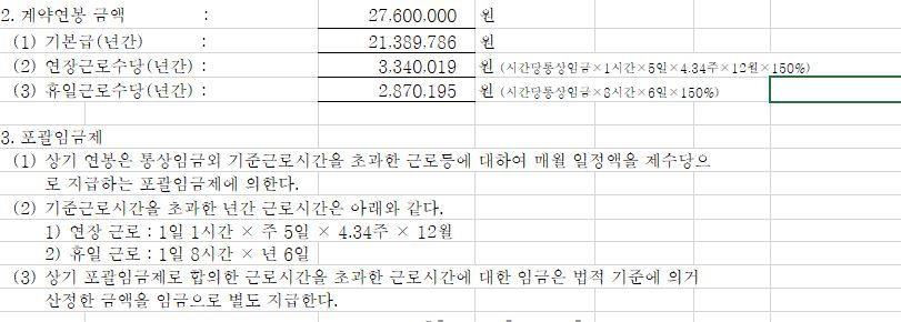 위와 같이 기본급+연장+휴일이 포함된 고정금액으로 연봉계약을 체결할 예정입니다.
