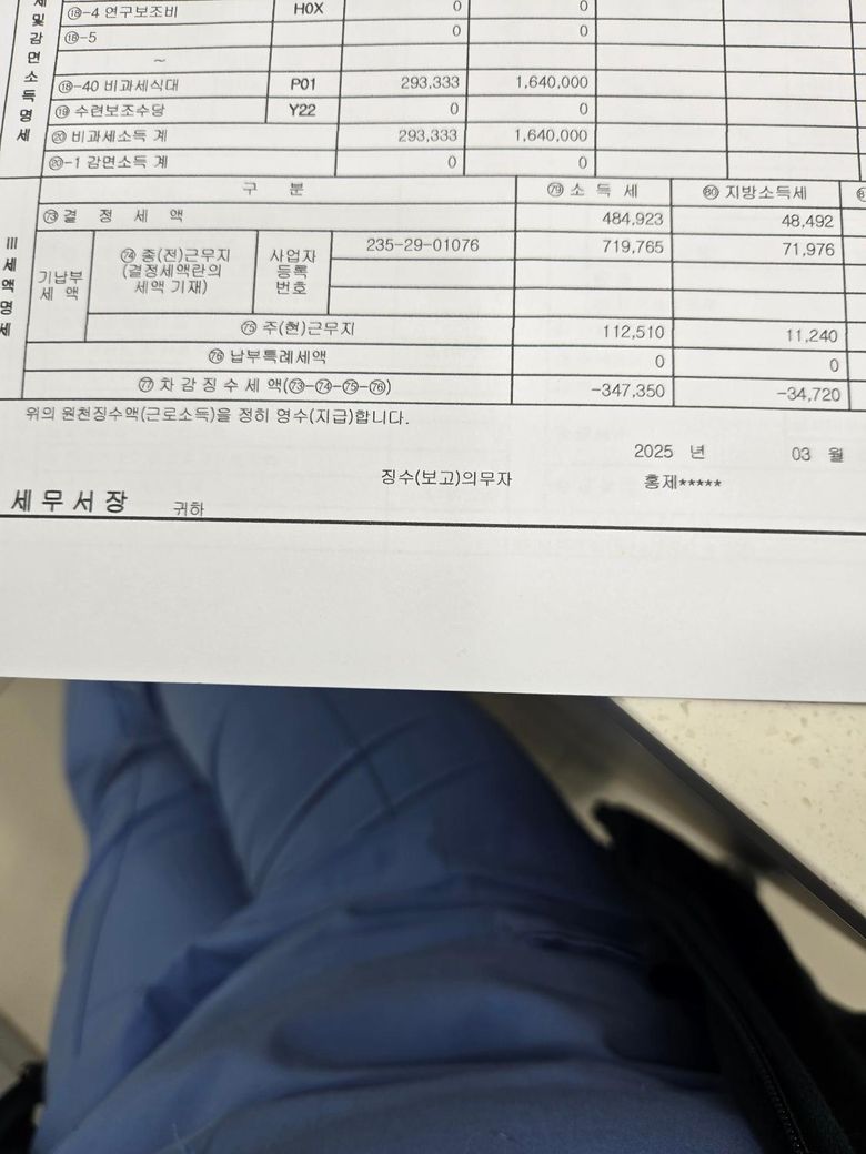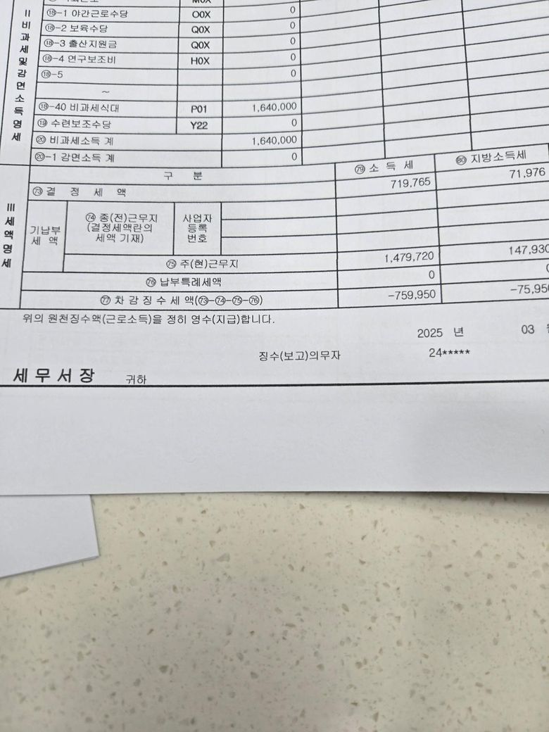 퇴사한곳 원천징수에는 기납부세액이 1.479.720 해서 환급금이 75정도인데, 새로취업한곳에서 연말정산한거합치고나서 금액이줄어서요..