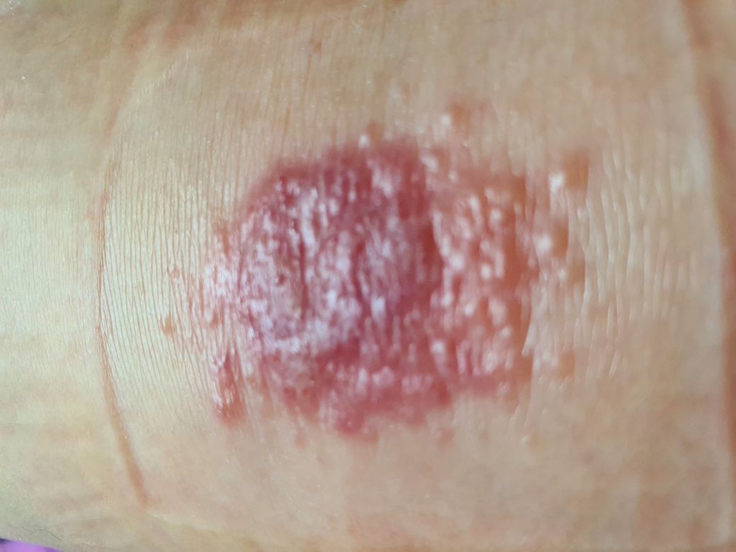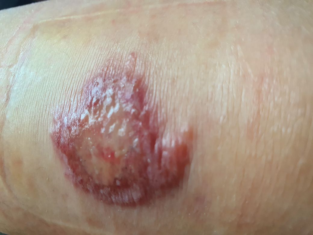 사진의 피부 병변 소견은 찰과상으로 인해 각질층이 벗겨진 뒤에 서서히 회복되며 딱지층이 생겨가는 과정에 있는 정도의 상태로 보입니다. 계속 잘 드레싱하며 경과 관찰을 하시면 충분할 것으로 보입니다.