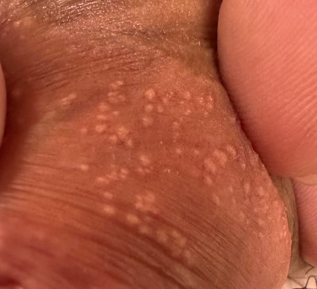 포다이스반 가능성 있습니다. 포다이스반은 피부의 피지선이 막혀 발생하는 작은 낭종으로, 대부분 미용적인 문제일 뿐 건강에는 큰 영향을 미치지는 않아요. 다만 미관상 좋지 않아 제거하려면 피부과에서 레이저 치료나 전기 소작술로 제거할 수 있습니다. 경우에 따라 외과적 방법으로도 치료도 가능하구요. 자가 관리로는 피부를 깨끗하게 유지하고, 비타민 A 성분이 포함된 제품을 사용하는 것이 좋습니다.