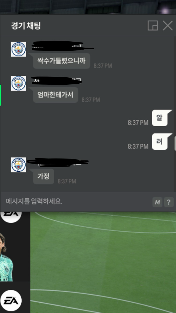 피파 축구게임을 하면서 상대방에게 패드립을 했습니다 성적 패드립은 안했습니다 올린 사진을 보시면 상대방이 어떤 말을하면 "너희엄마처럼?" (영어로 쓰여진 부분) 이런식으로 패드립을 했는데 통매음 모욕죄 성립이 될까요? 물론 상대방도 패드립 비슷한 말을 했는데 고소가 되는지 모르겠습니다. 중간중간에 제가 상대방 채팅을 차단해서 보지 못한 부분도 있는데 고소 당한다면 상대방이 했던 채팅들도 볼 수 있나요? (상대방이 제가 차단한 시점에서 패드립을 했을 가능성이 있기 때문에 ㅁ)