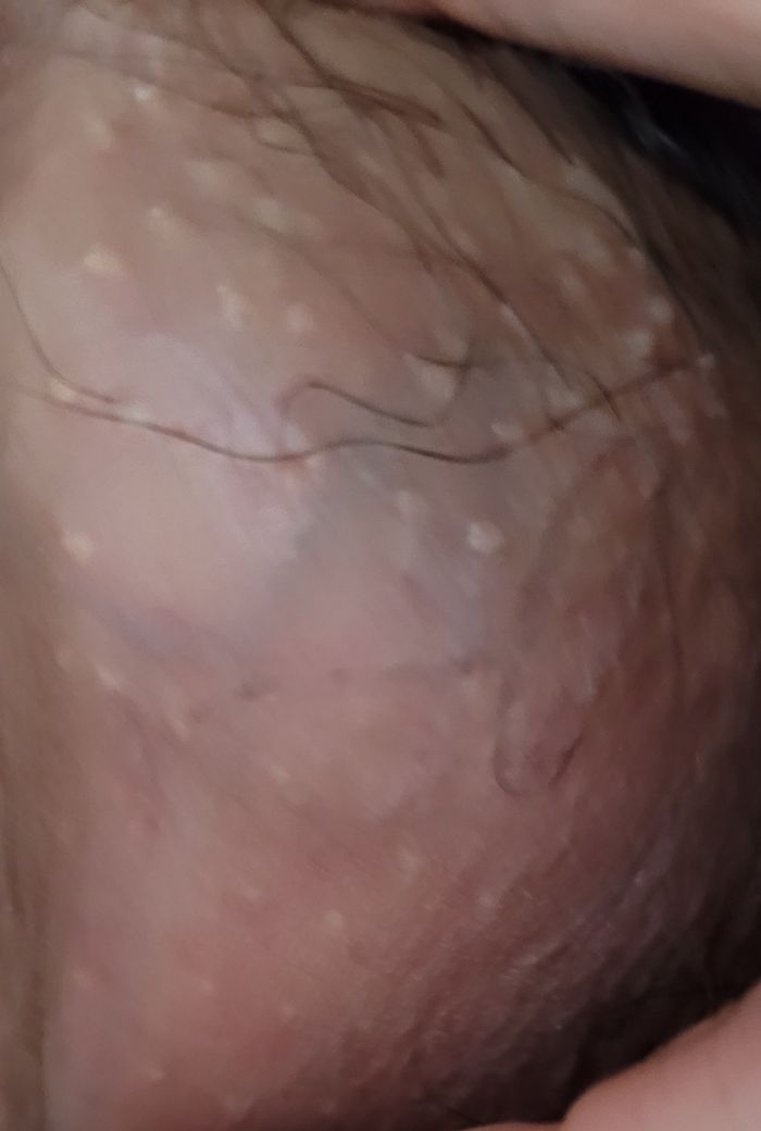 성기부분을 자세히 보시면 모낭과 모낭에 연결된 피지선 때문에 저렇게 하얗게 보이실 수 있습니다.