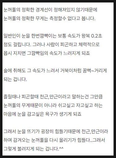 우리가 졸릴때 눈꺼풀이 천근이다 라고 표현하는데 실제 졸릴때 눈꺼풀의 무게는 어느정도 될까요 과학적으로 혹시 측정 가능할까요?