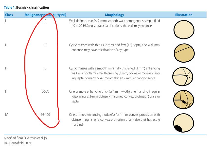 혹은 크게 낭성종괴와 고형종괴라 나누어집니다. 낭성종괴는 소위말하는 물혹을 이야기하는 것이지요. 낭성종괴의 경우는 혹의 크기 모양 성상에 따라서 보스니악분류를 하게 됩니다. 그리고 이 분류에 따라서 악성가능성이 어느 정도 되는지를 추정합니다.
