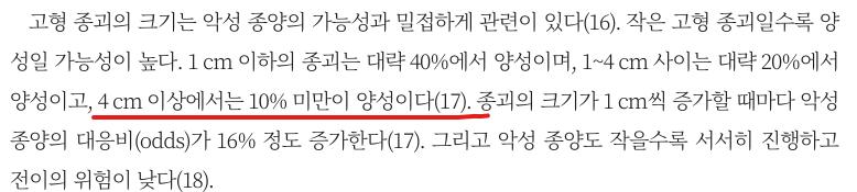 신장에 나타난 고형종괴를 평가를 할 때는 CT에서 음영의 정도, 균질함의 정도, 지방 조직의 유무, 조영증강등을 살펴보아야 합니다. 특히 조영증강이 중요한 요소가 되겠습니다. 하지만 현재 환자분의 경우는 낭성종괴인지 고형종괴인지도 확실하지 않고 나머지 소견도 알지 못하는 상태로 유일한 정보는 크기가 4.5cm 이라는 것이 됩니다. 만약 낭성종괴라면 앞서 말씀드린데요 보스니악 분류를 따르게 되면 이 경우는 크기보다는 병변의 성상에 따라서 분류를 하고 이에 따를 악성확률을 알 수 있습니다. 아래 논문에 나와있는 문구를 캡처했습니다.