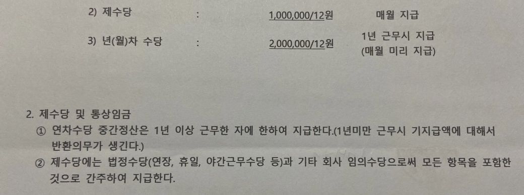 2020년 9월입사 2021년 7월퇴사하였고 작년엔연차없다해서 안쓰고 21년도에 연차 생겨서 6개썼습니다 오늘 갑자기 급여명세서랑 원천징수영수증 주더니 1년안다녀서 연차수당 뱉어내라고 연락이 왔는데 1년이상안다녀서 이돈 돌려줘야하나요? 근로계약서에 이렇게 쓰여있어요