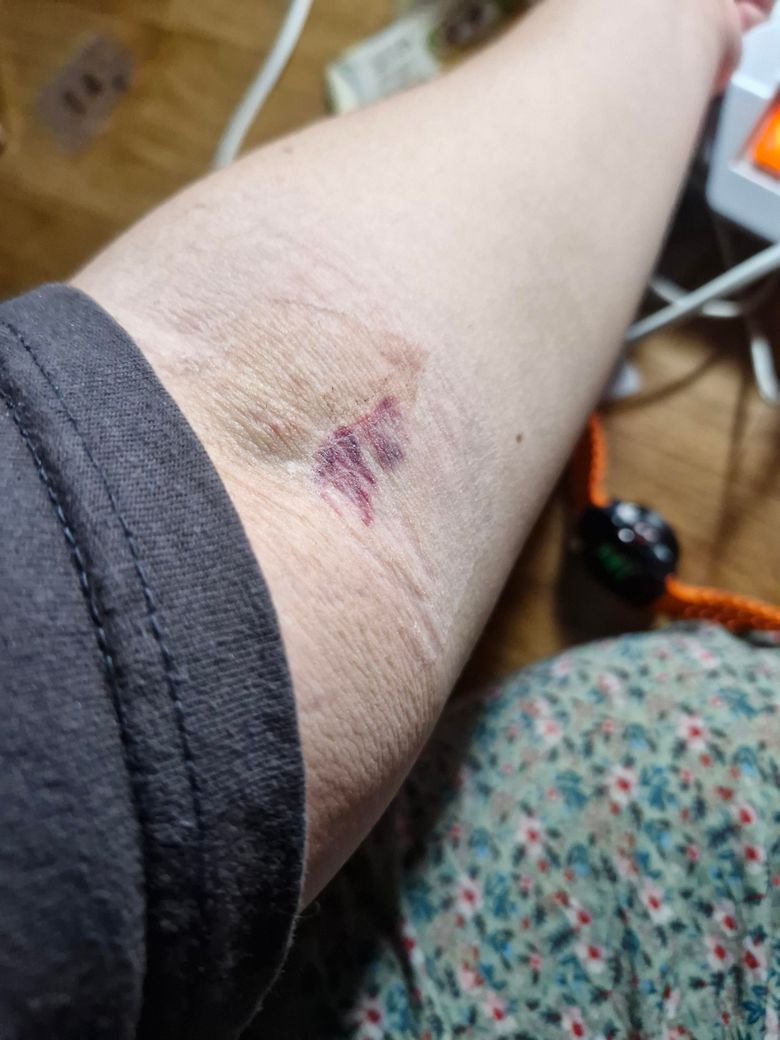 어제 블록시술받고 링거맞고 팔에 피가고여있고 딱딱하게 만져지고 좀 부었는데요 어떻게해야할까요?