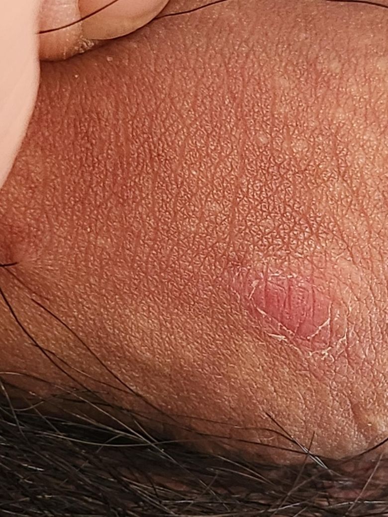 매독을 의심할 수 있는 병변은 무동의 궤양성 병변이 생기는 연성하감이 생기는 것이 전형적인 증상 소견에 해당합니다만, 사진의 소견은 궤양성 병변이 아닙니다. 그보다는 단순한 국소적 염증 반응일 가능성이 높아 보이는 소견입니다. 해당 사진을 통하여 매독 여부를 강력하게 의심하고 감별 진단 내리는 것은 가능하지 않습니다.