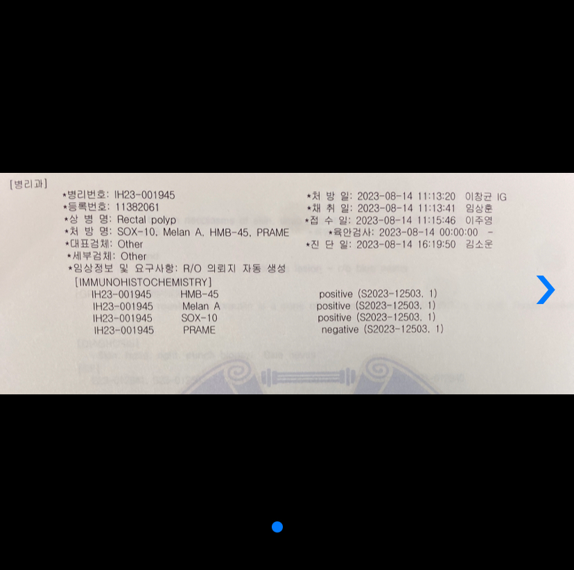 상기 항목들은 흑색종일 때 양성반응을 보이는 면역화학염색법을 시행한 결과이고, 모두 양성반응을 보이고 있어 흑색종이 의심되는 상황으로 보입니다.