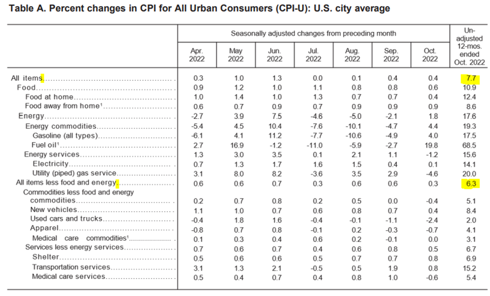 지난 10월 미국 각 부문별 CPI를 보면 전체 CPI 증가율은 7.7%인데 식음료 10.9%, 에너지는 17.6%에 달합니다. 에너지 물가가 근래 물가 상승의 주범입니다. 미연준의 파월 의장은 물가 수준이 4% 내외로 제어가 되어야 금리 인상을 그치겠다고 단언한 바가 있습니다.