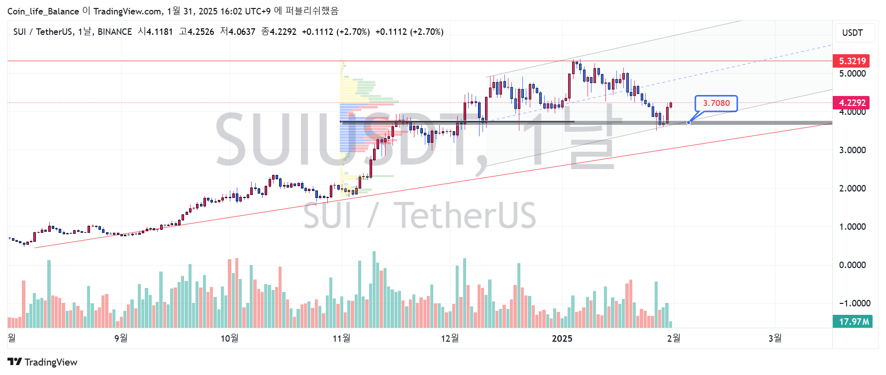 현재 수이 코인의 가격 흐름을 체크 해보면 4.23$로, 매물대 3.7$에서 지지를 받고 상승하고 있습니다. 이 지지가격을 유지해준다면 개인적으로 꾸준한 상승을 보여줄 저력이 있는 코인으로 판단 합니다.