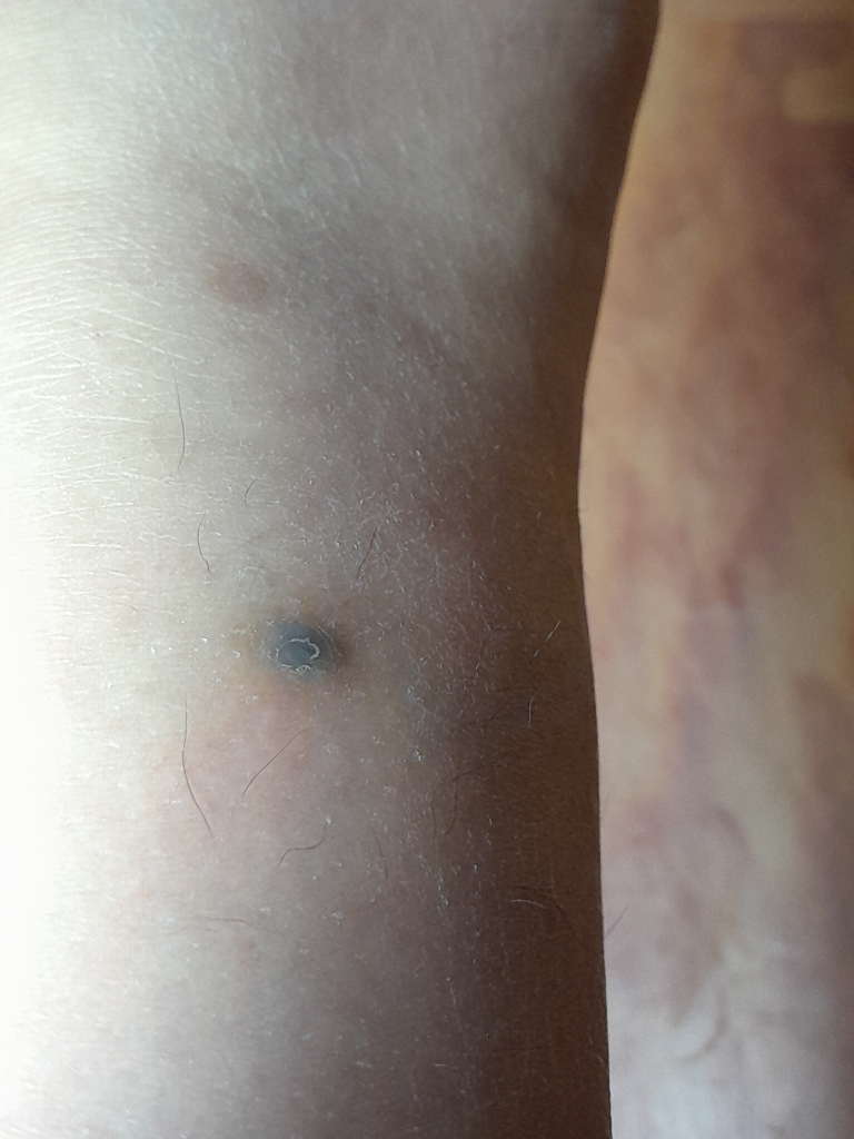 사진으로 보이는 병변은 검은색이고 수년간 크기 변화가 거의 없었다면 흔한 점, 피지낭종, 혈관종 등 양성 병변일 가능성이 높습니다. 몇 년째 변하지 않았다면 급성 악성 가능성은 낮지만 표면이 볼록하거나 색이 진한 경우엔 피부과에서 확인을 권장합니다.