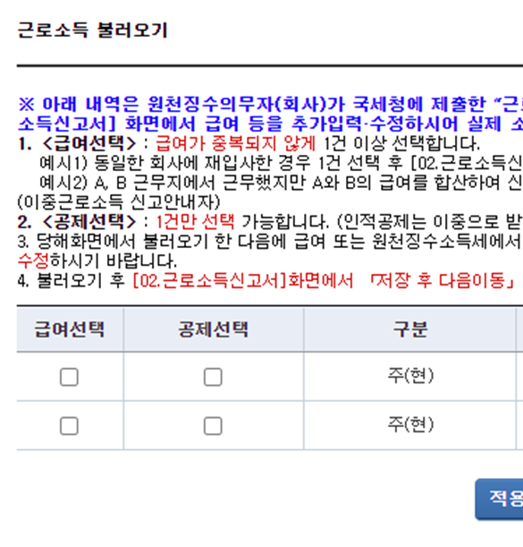 근로소득 불러오기를 하니 위는 A 회사이고, 아래는 B 회사입니다.