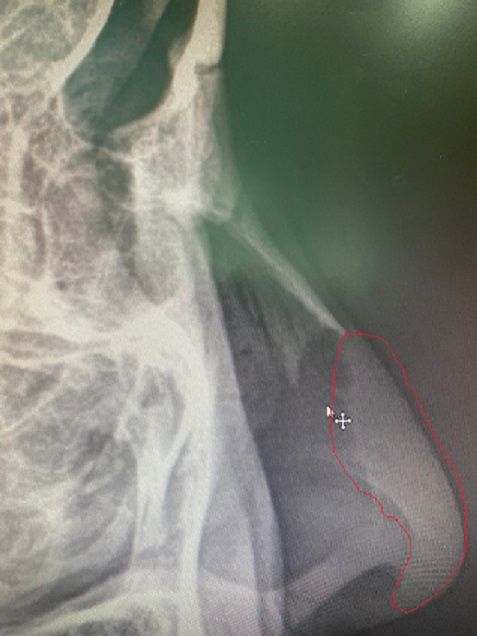 코 엑스레이에 대해 궁금하시군요. 붉은색으로 표시하신 부분은 코에 존재하는 연골입니다. 뼈보다는 덜 하얗게 보이지만 분명 그 윤곽을 확인할 수 있습니다.