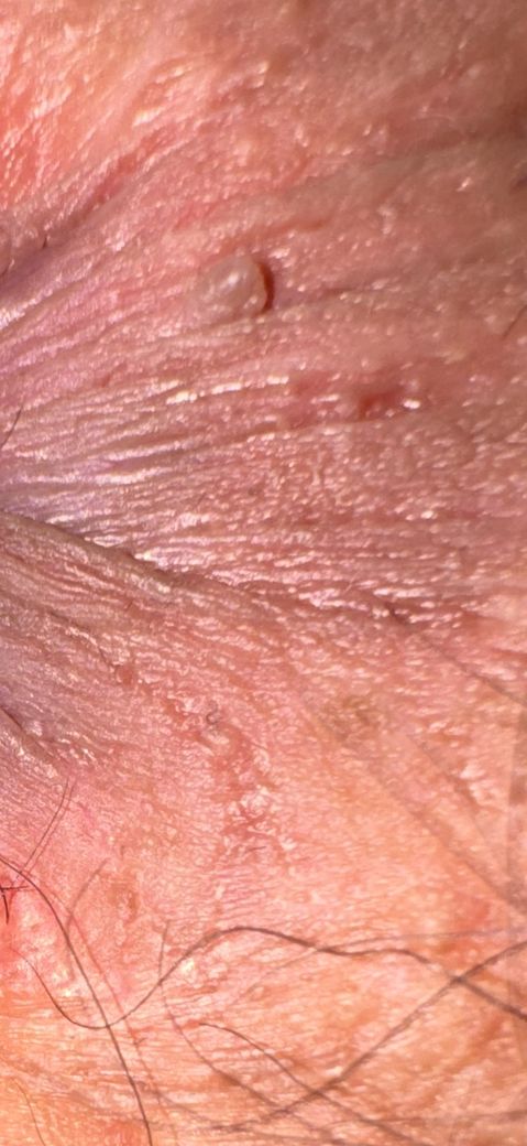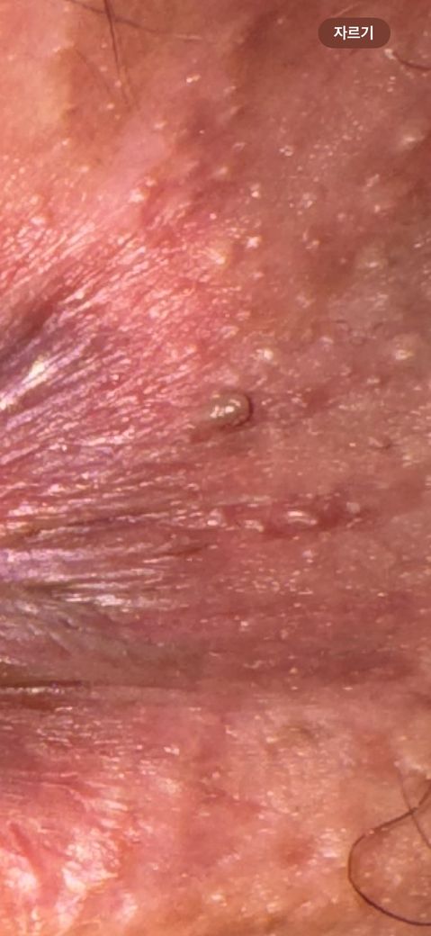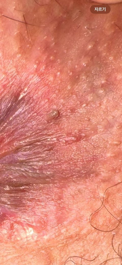 사진상 병변은 전형적인 콘딜로마 형태와는 다소 차이가 있습니다. 콘딜로마는 보통 표면이 거칠고, 여러 개가 모여 꽃양배추처럼 불규칙하게 증식하는 양상을 보이는 경우가 많습니다. 반면 현재 보이는 병변은 비교적 표면이 매끈하고, 단일 혹은 소수의 둥근 구진 형태로 보여서 다른 가능성도 충분히 고려해야 합니다.