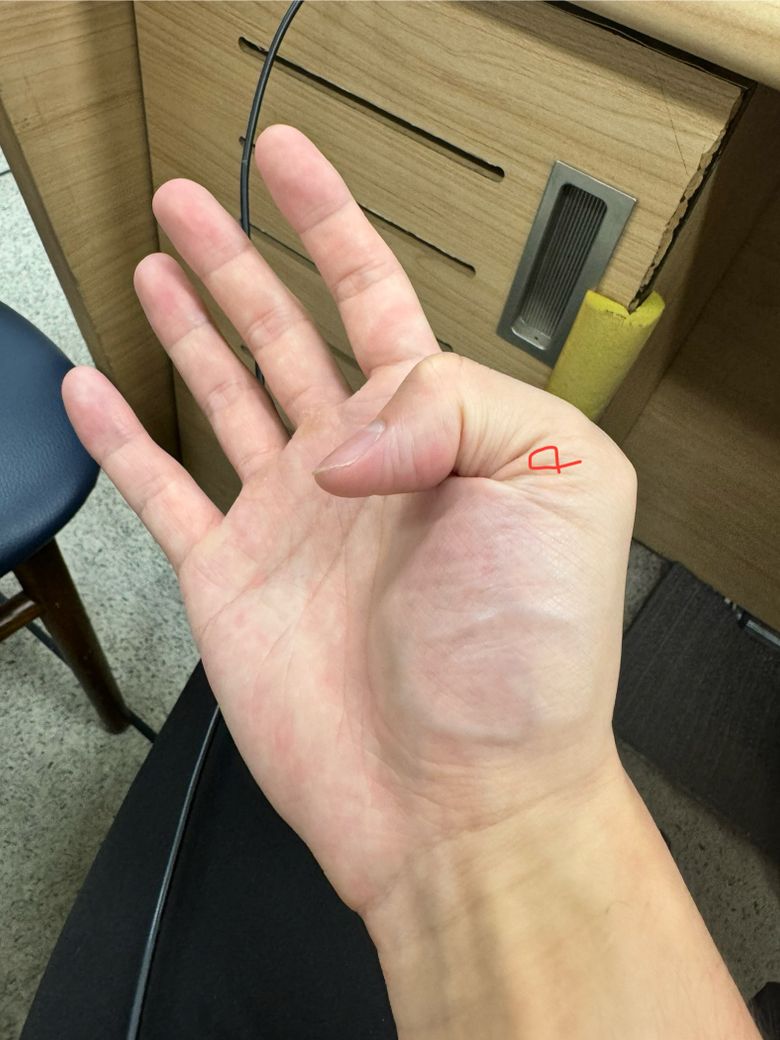 예전에 바쁜 요식업장에 일하다가 그만뒀는데 그 때 설거지 같은 엄지손가락을 많이 쓰는 일을 해서 그런지 아픈 게 지금 올라오는 느낌이에요.. 사진 속 동그라미 부위를 누르면 관절 같이 동그란 뼈가 있는데 그 위쪽 형광펜 빨간 부분을 누르거나 굽힐 때 아파요. 풀어주거나 움직여주면 잠깐은 괜찮은데 자고 일어나거나 안 움직이면 또 뻐근하고 불편하네요. 증상이 뭘까요??