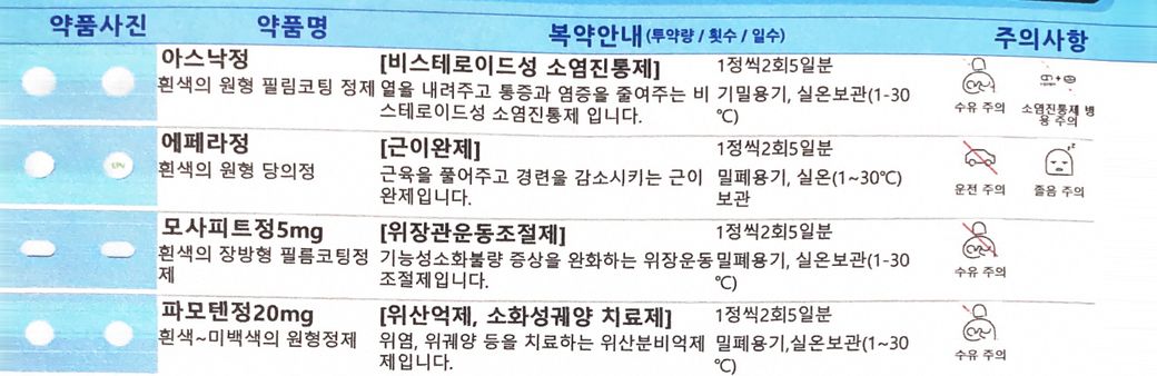 약 복용에 관한 질문을 주셨습니다. 서로 다른 질환으로 약을 받으셨습니다. 하지만 같은 작용을 하는 약이 섞여 있으므로 조절을 하는 것이 좋겠습니다. 아스낙정과 펠루비정은 모두 NSAIDs계열의 약이므로 조절해서 복용하시면 좋겠습니다.