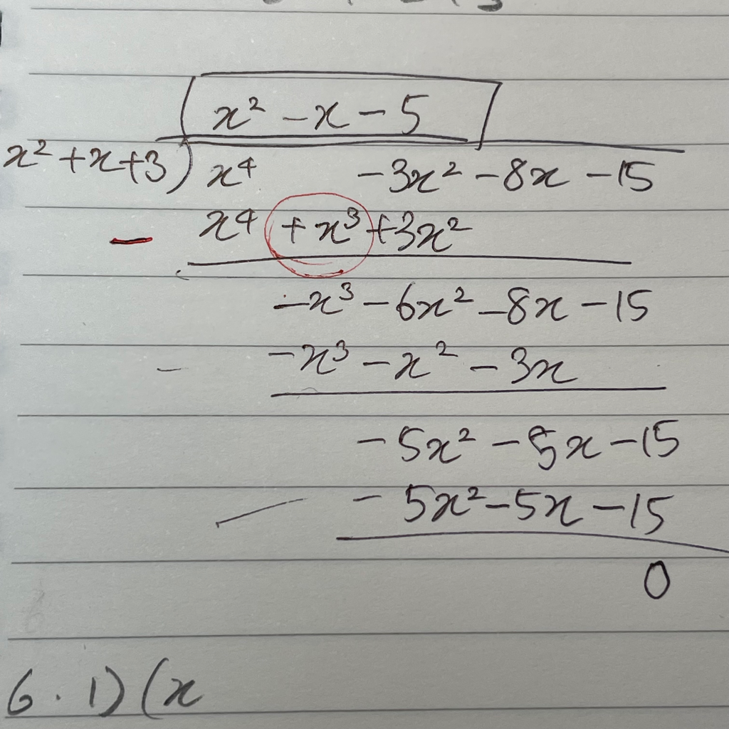 분자인 (x⁴ + 0x³ -3x² -8x -15)에서 나머지인 (x⁴+x³+3x²)를 빼는 과정이 때문입니다.
