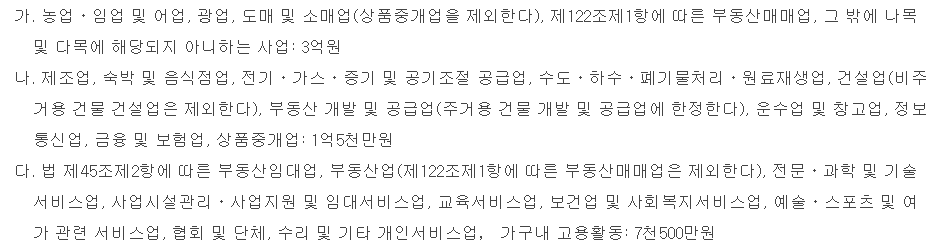가. 농업ㆍ임업 및 어업, 광업, 도매 및 소매업(상품중개업을 제외한다), 제122조 제1항에 따른 부동산매매업, 그 밖에 나목 및 다목에 해당되지 아니하는 사업: 3억원 (2013. 2. 15. 개정)