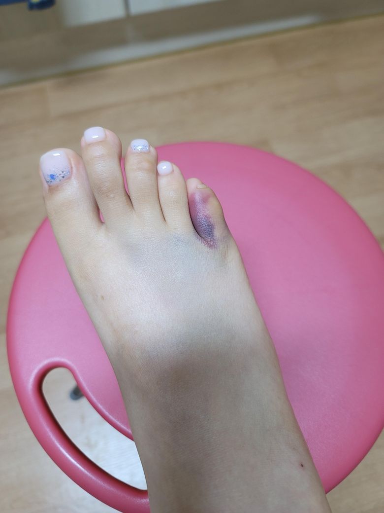 어제 새끼 발가락 골절됬는데 피멍이 심하게 들었고 깁스는 안하고 있는상태에요 멍은 어제보다 심한상태인데