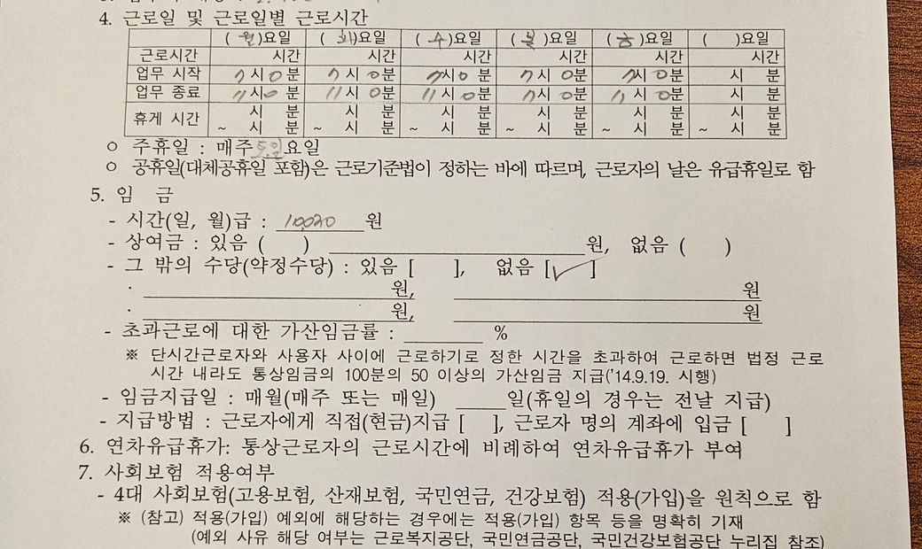 아르바이트를 처음해보는 20대 초반입니다. 평일 오후 7시에서 11시까지 일하기로 계약했는데 주휴수당에 대해 잘 몰라서 여쭤봅니다. 혹시 주휴수당이 나오는 건가요? 사진은 단시간근로자 표준계약서 입니다.