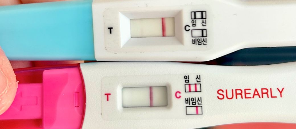 아래의 임신테스트기가 더 이후에 확인한 것으로 보이는데 여기에는 확실한 한 줄로 비임신이라고 판단할 수 있습니다.
